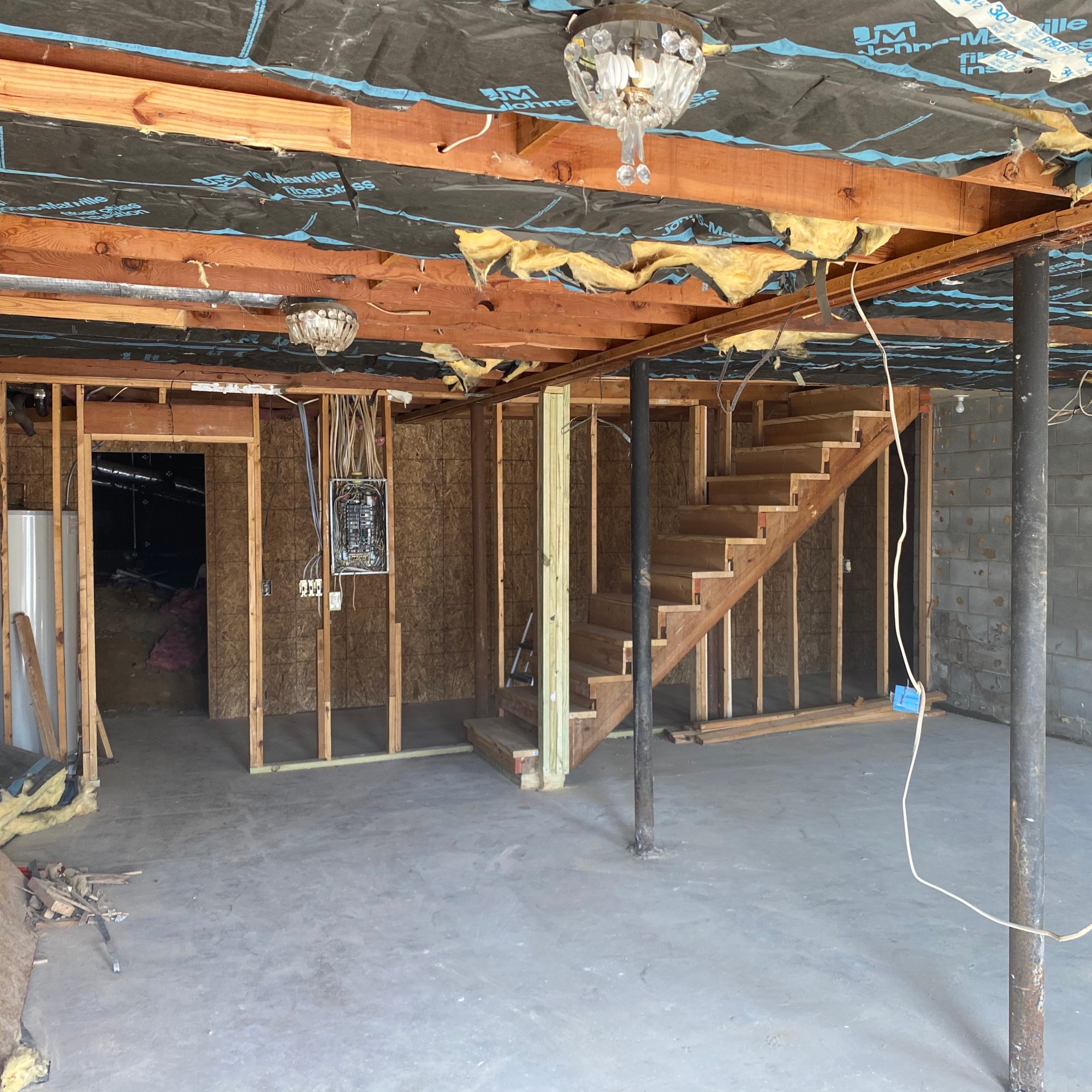 The electrical panel is in the garage and the wiring was a wonky mess, so we took this opportunity to replace it and rerun new wiring in there. Ronny is forbidden to do electrical work of any kind so thankfully we have found a good electrician. We now have a new labeled electrical panel with functional breaker switches! The AC ducting got moved to the sides of the garage, opening up the staircase entrance and center of the garage a ton. Obviously this is still a work in progress and a far cry from a functional garage, but this area of the house is structurally sound at this point! What has taken the most amount of time with this space has simply been decision making. We went back and forth on things like adding support to the already existing steel beams or replacing entirely…and we got several bids for each project down there, trying to take cost and quality both into consideration.