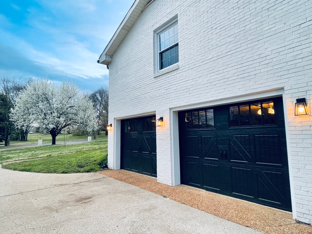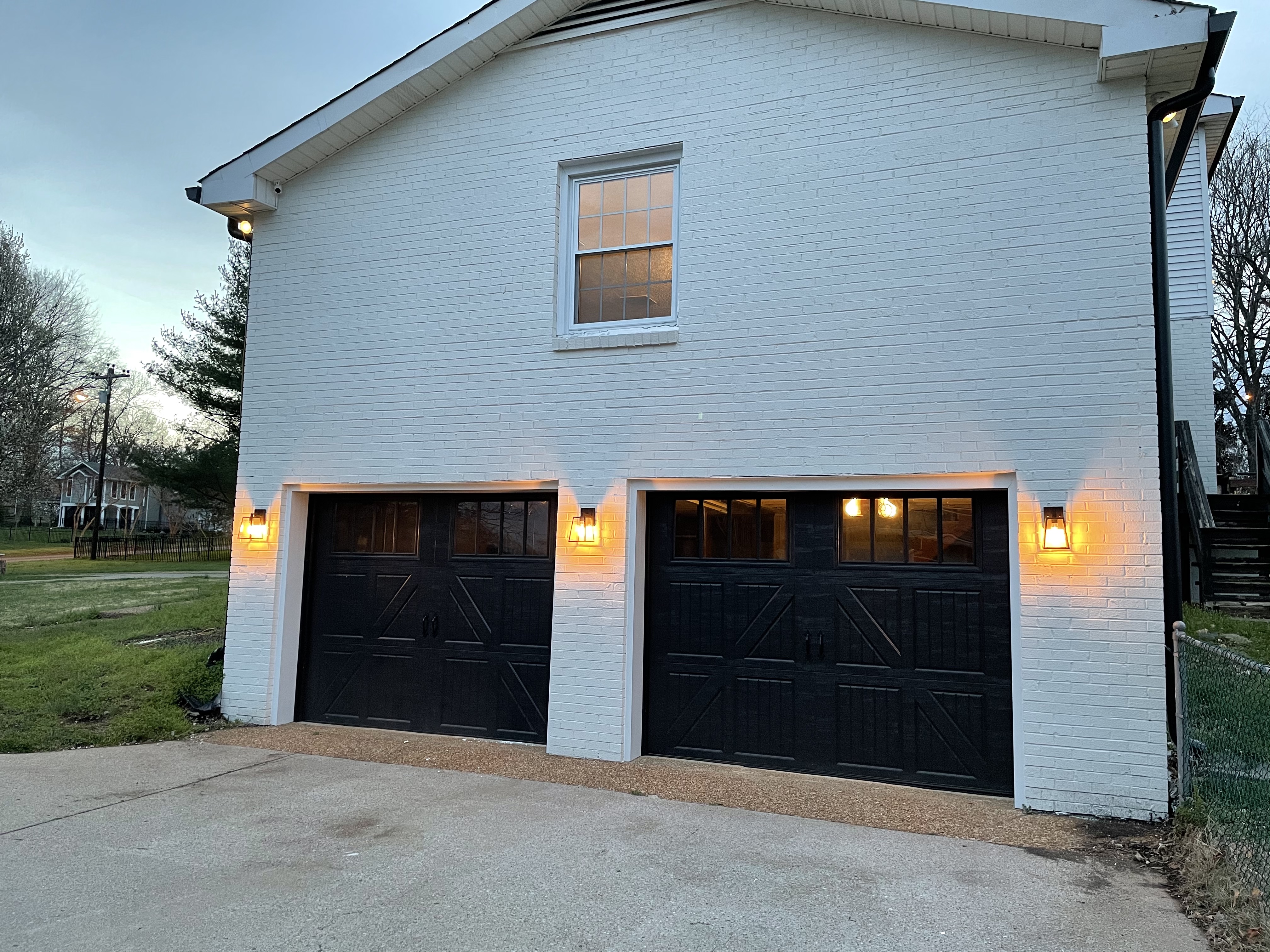 The first thing we had done to the house was demo the garage level and replace the steel support beams. It had been built out into a maze of several rooms which were primarily used for hoarding. The walls were all wood paneling and the floor was built up above the concrete floor with substantial water leakage coming in underneath from the cinderblock walls. While the front brick was set up for garage doors, these holes had been covered with plywood and windows and it seems there never were actual garage doors on it – at least that’s what our neighbors say who are original owners in this neighborhood. While we haven’t been parking our Porsches in the garage recently, its been incredibly useful..storage construction, a waiting area for appliances and fixtures, kid’s scooter/bike parking, and of course our haphazard home gym (priceless in 2020). We still have a ton of work to do down there, but the easily accessible space has been a lifesaver for our needs. And adding a true garage is generally strongly desirable for resale. We went with Amarr doors through Costco – aluminum with a wood “look”. There’s a ton of options for customizing these, and the product is super durable while still being attractive. The windows in the doors were an easy choice for us since our garage has no windows and we love the way they look and bring light in – definitely makes the space a little less dungeon-ish. The exterior sconces are Timberland brand from Target. Not amazing quality but they look great, were very affordable and easy to install. Also, I’m annoyed to say that they are now on sale since we bought them!!