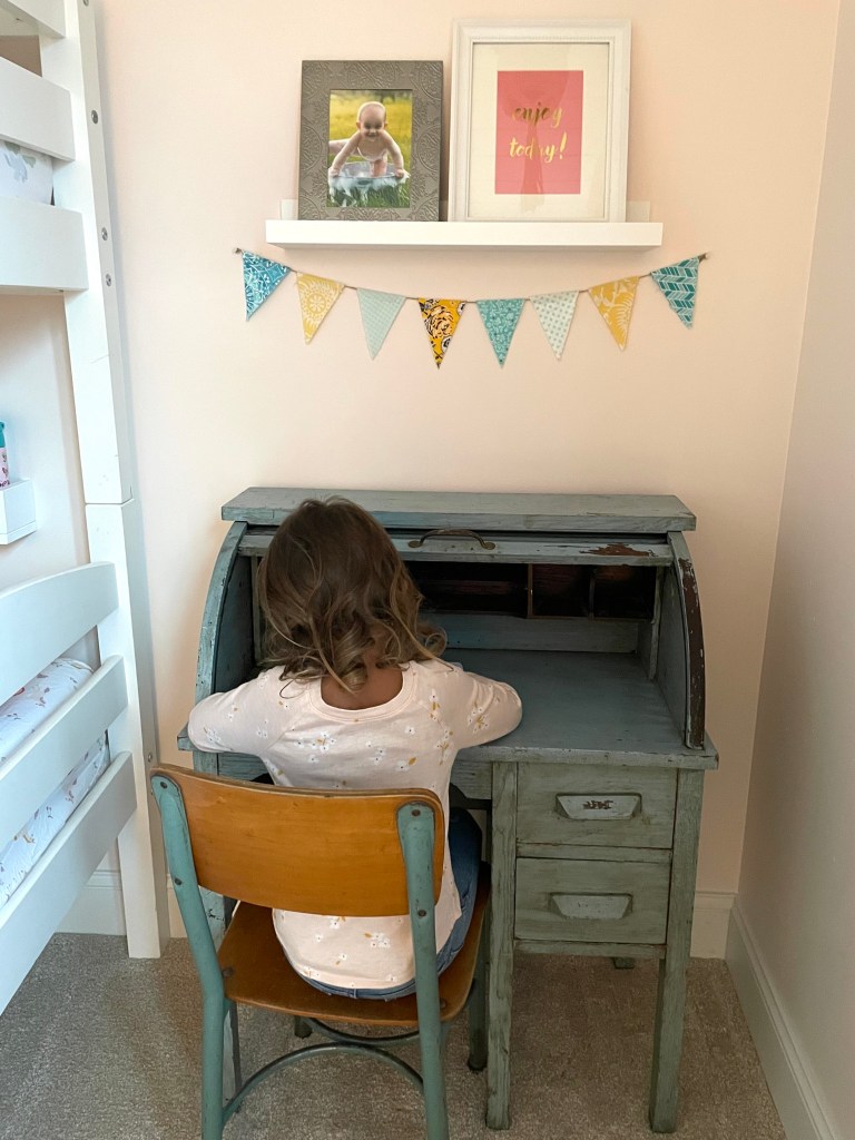 This chair is one of their favorite hangouts. Easy to install but obvi get that sucker in a stud. The cozy blanket is from PBTeen and the rainbow pillow from World Market. Isla’s desk was an old piece my uncle got rid of years back and the chair was from my mom’s bedroom growing up.