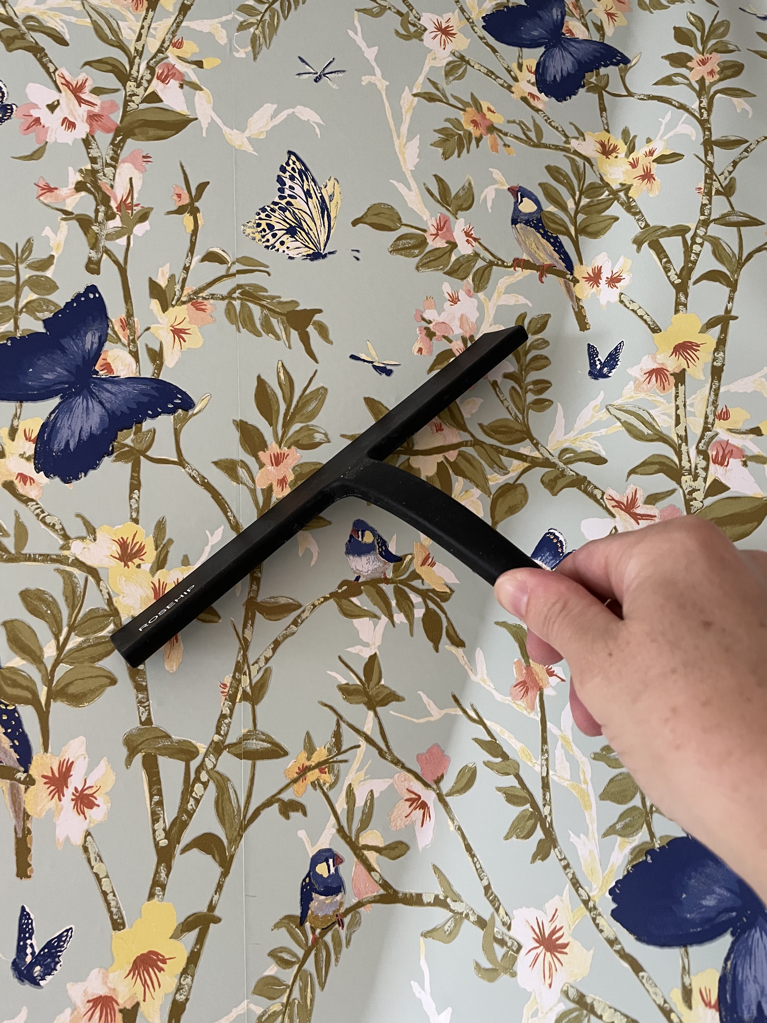 At first I tried to tackle this project on drywall that only had one thin coat of primer. I had to stop and apply a second coat of primer since it wasn’t sticking well. After the first sheet I applied, I got balsy and started using just my hand to smooth as I peeled off the paper…not a good idea. Some annoying air bubbles developed and I had to redo a full strip. Go SLOW and use the squeegee (moving from center out).